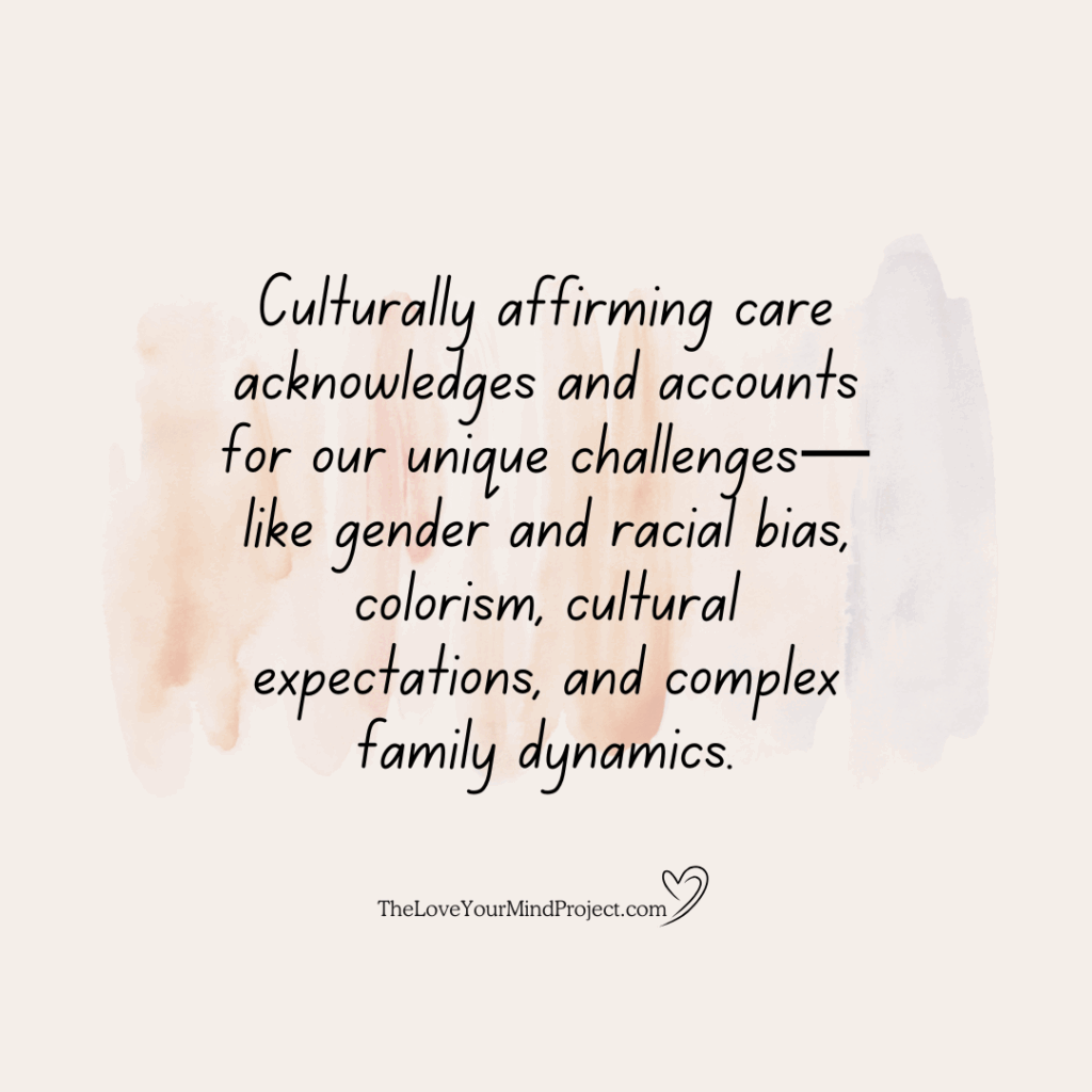 Culturally affirming care isn’t just about finding a therapist who looks like you. It’s connecting with someone who understands the context—gender and racial bias, colorism, cultural expectations, and complex family dynamics—and can help you navigate it.
