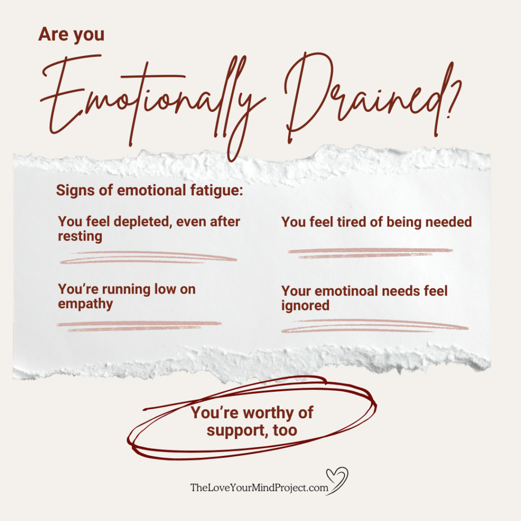 If you feel depleted, irritable, emotionally numb, or overwhelmed even after rest or time to yourself, you may be emotionally drained. In addition to feeling physical fatigue, you might notice less patience, empathy, or emotional capacity overall.
