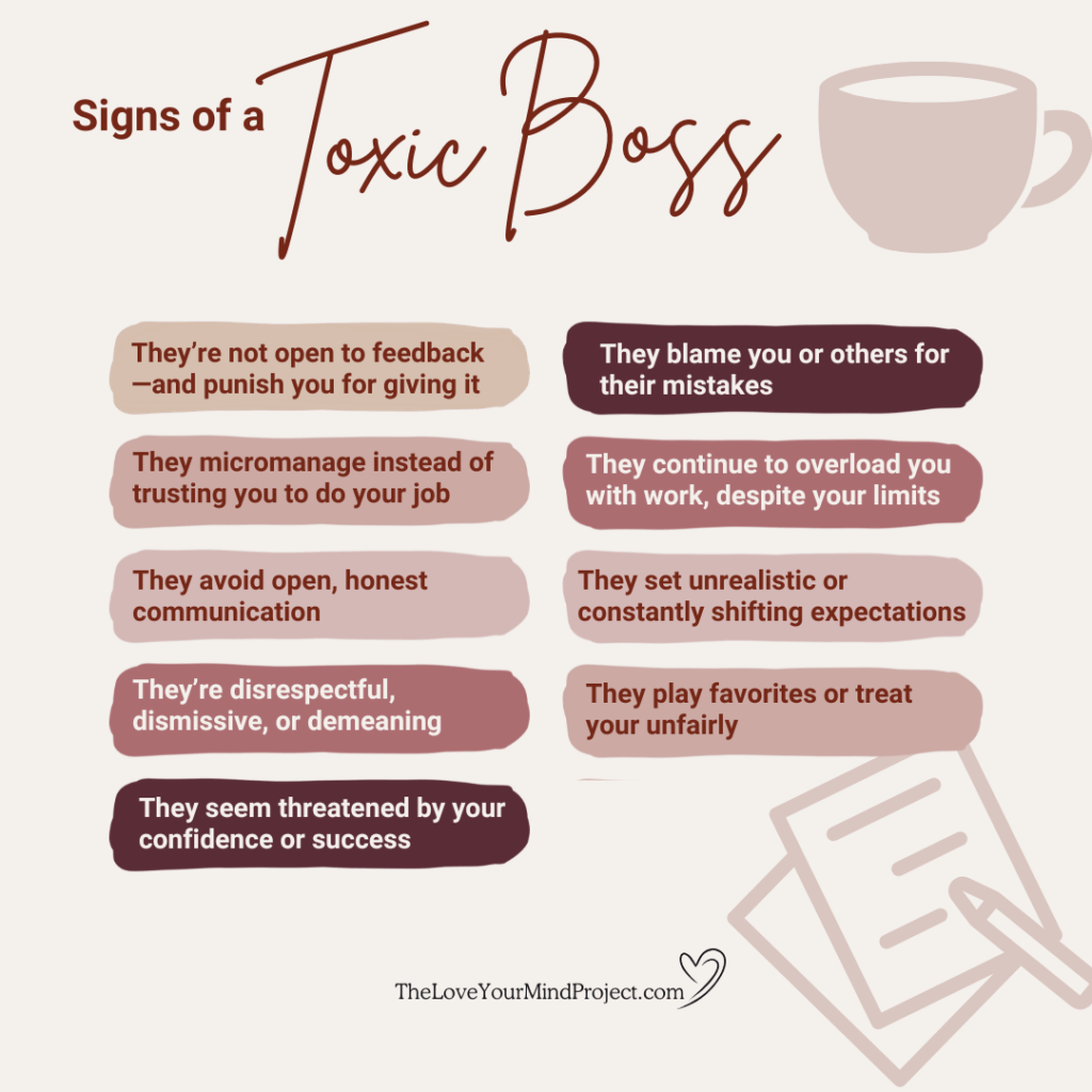 Common signs include micromanagement, lack of boundaries, disrespect, favoritism, and other behavior that consistently leaves you stressed, anxious, or doubting yourself.