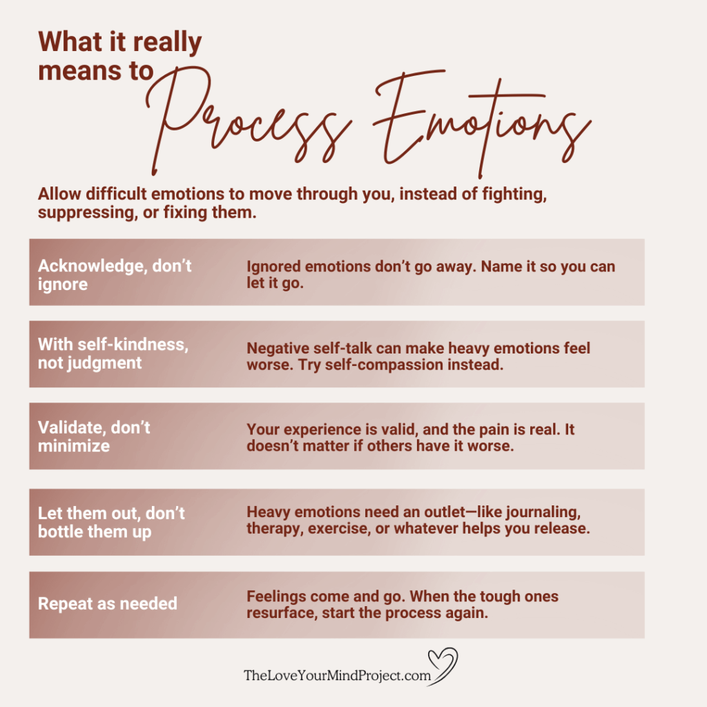 Processing emotions means allowing yourself to fully experience a feeling without trying to hide, judge, or rush it away—so it can eventually leave your system. It’s the opposite of pushing through, rejecting, or fighting to “get over” how we feel.